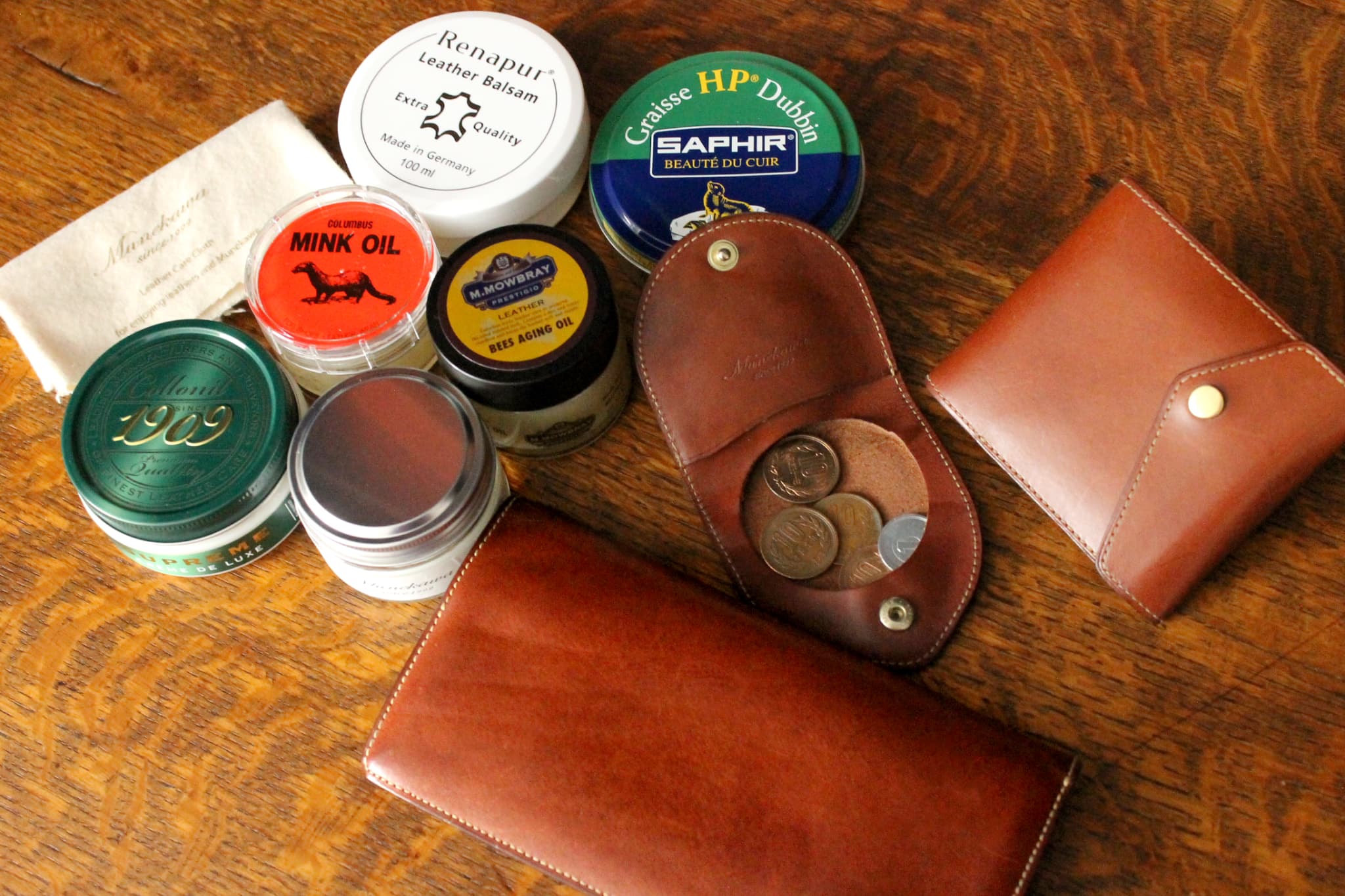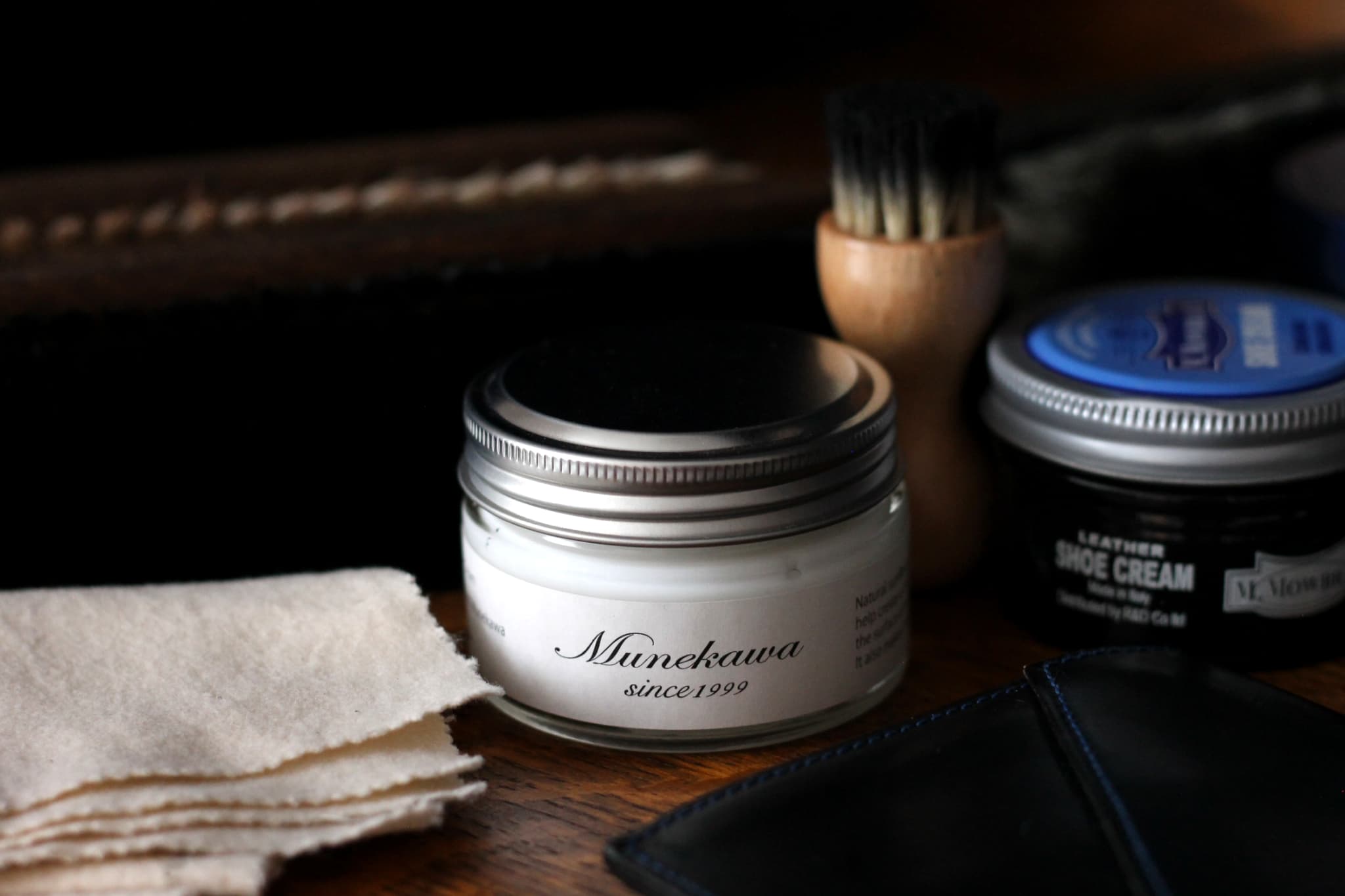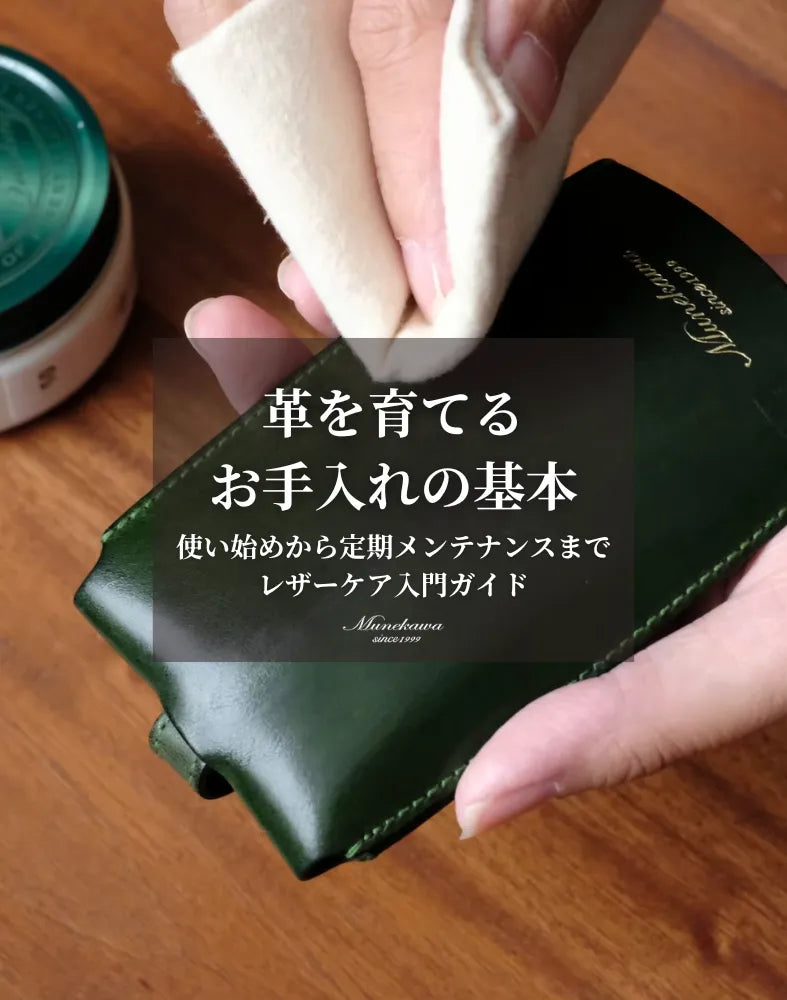 Munekawaでは、革にやさしく幅広く使えるオリジナルのケアクリームをご用意しています。扱いやすく、初めての方にも安心してお使いいただけます。