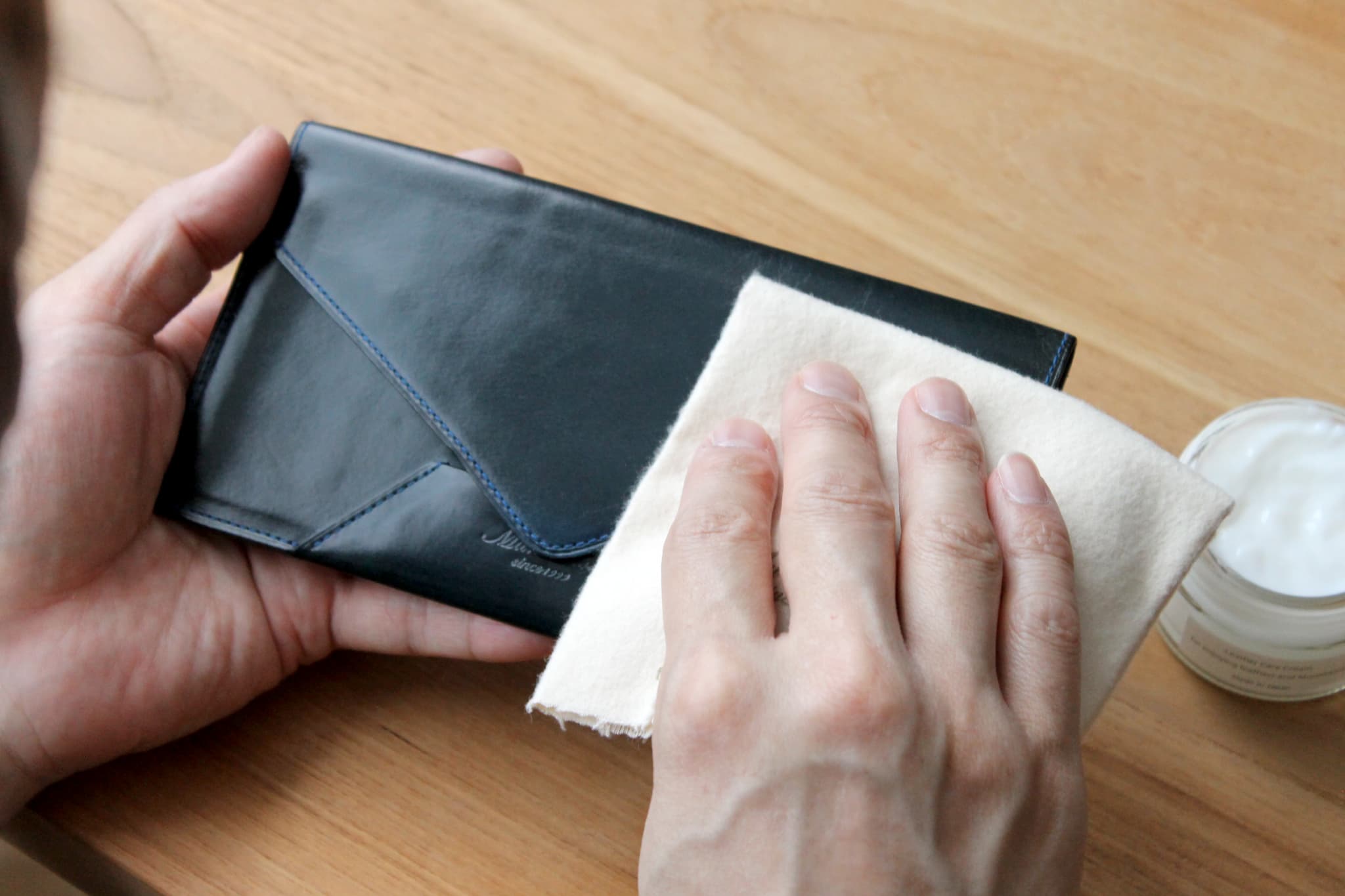 2. 革製品全体にクリームを指で薄く塗布する