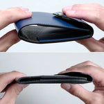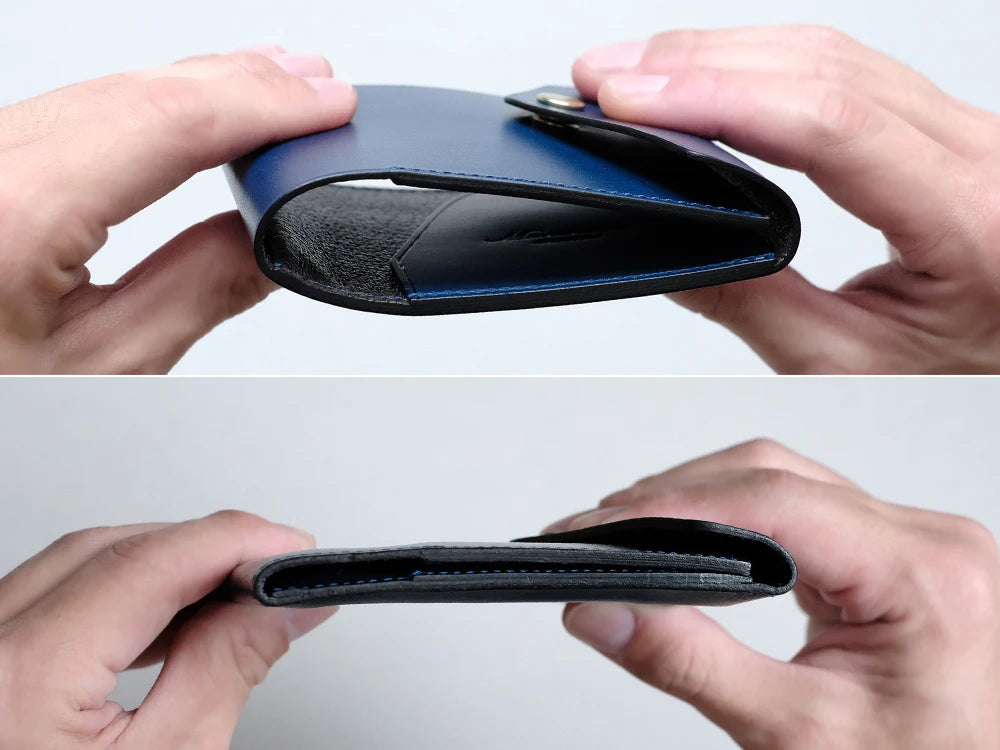 The leather is taut, so it will be puffy at first, but as you start to use it, the leather will become more comfortable and thin to about 9mm. The asymmetrical leather parts hold the bills, allowing you to take them out beautifully and smoothly, and there is no problem with them falling out. The card pocket can hold about 8 cards when the leather is still firm, and as it becomes more comfortable, it can hold up to 15 cards. The wallet is made of vegetable tanned leather, which has an attractive transparent appearance that allows you to feel the individuality of the leather. There may be wrinkles or traces of blood vessels, but this does not affect the quality. We hope you will enjoy the different expressions of each piece.