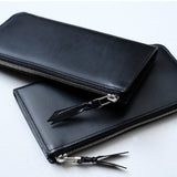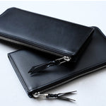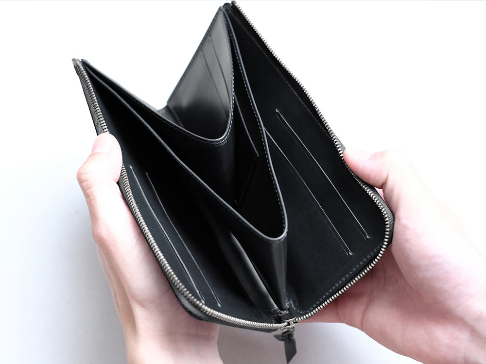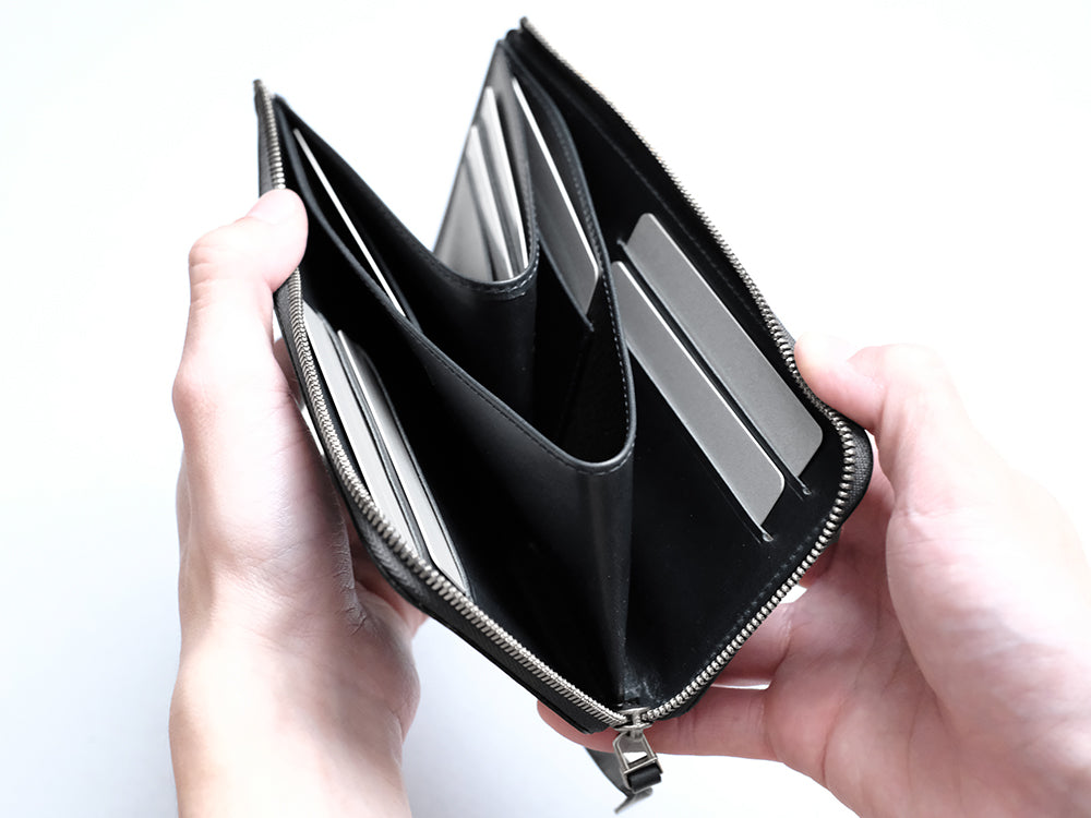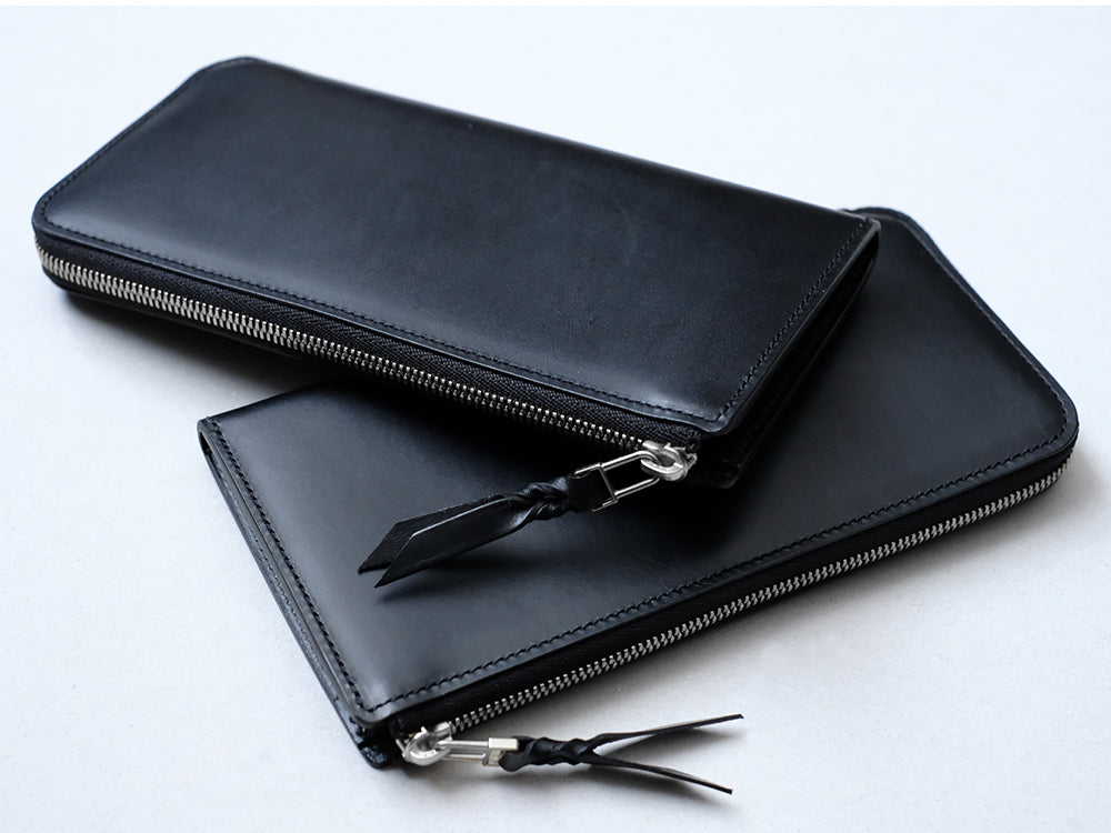 The shape is a long wallet version of the L-shaped zipper wallet "Cram." From conception to completion, this long wallet features a unique structure that was developed through repeated in-house prototyping and refinement.