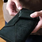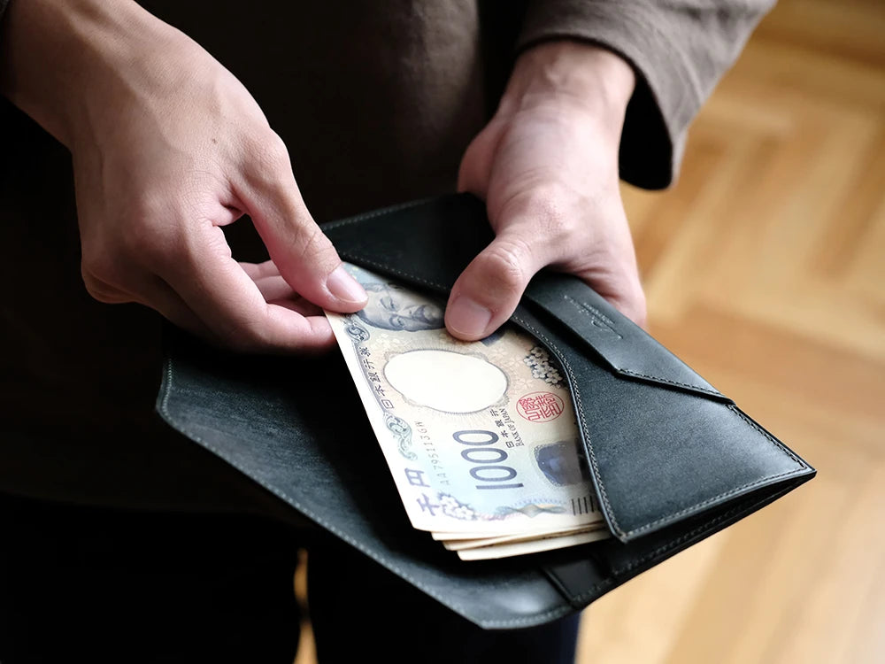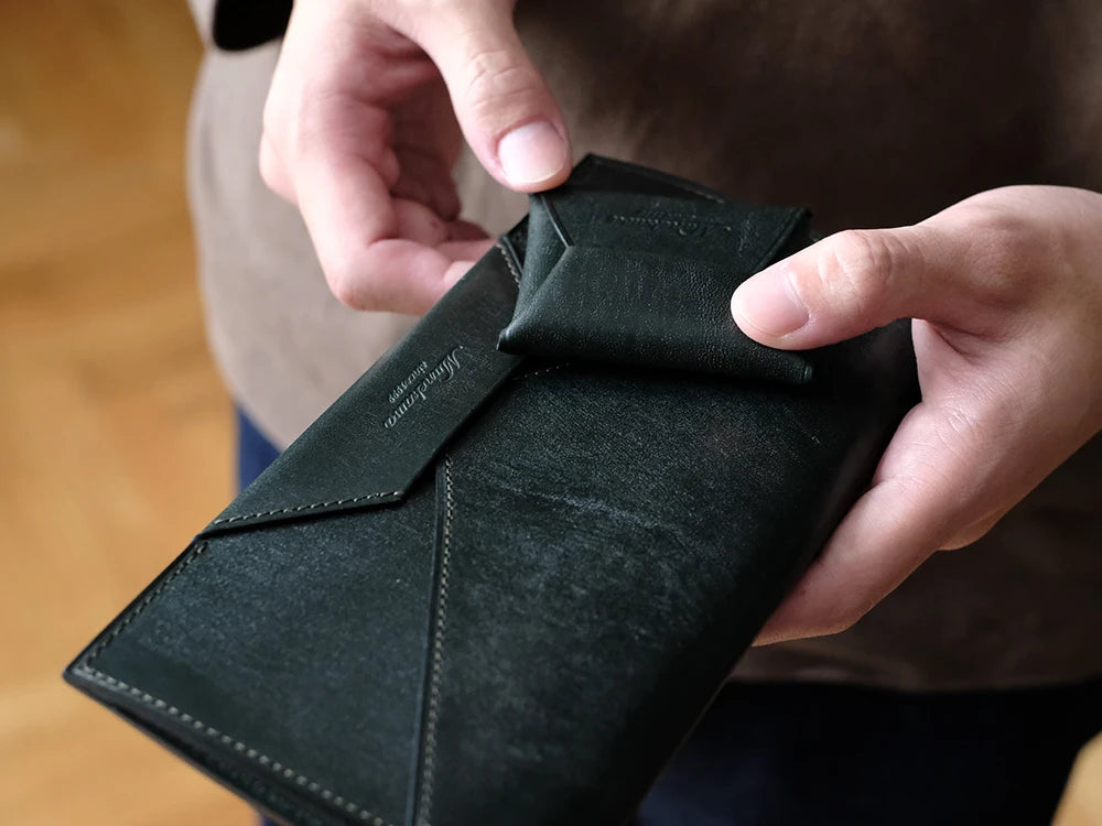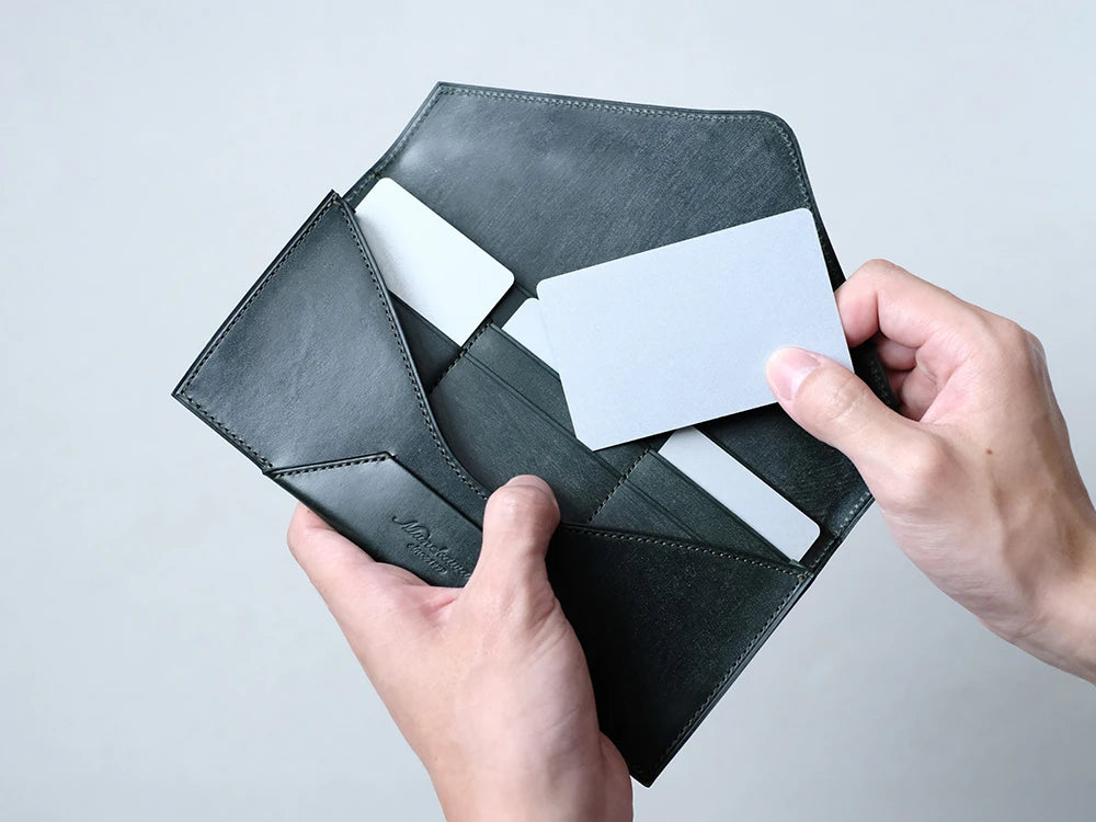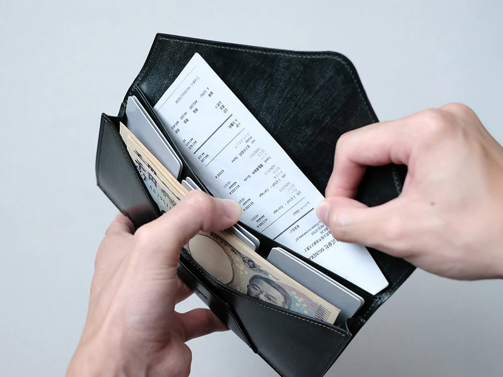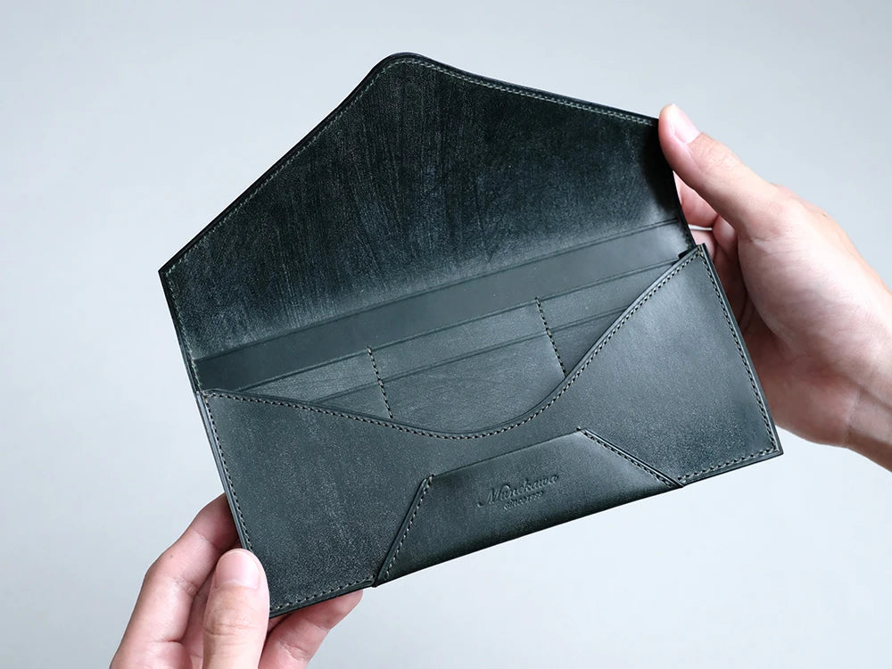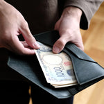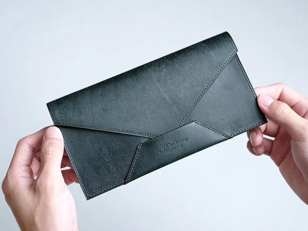 ファスナーやホックボタンなどの金具を使用せず、他には無い封筒型の形状は、見た目の美しさだけでなく、使用時の所作も美しく見せるために考え抜いたデザインです。