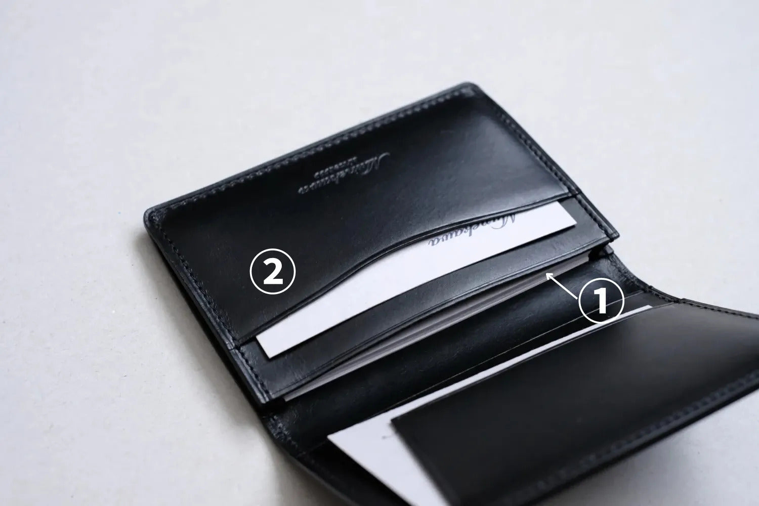 ①メインポケット部分は、一般的なサイズの名刺がおよそ20枚ほど収納可能です。