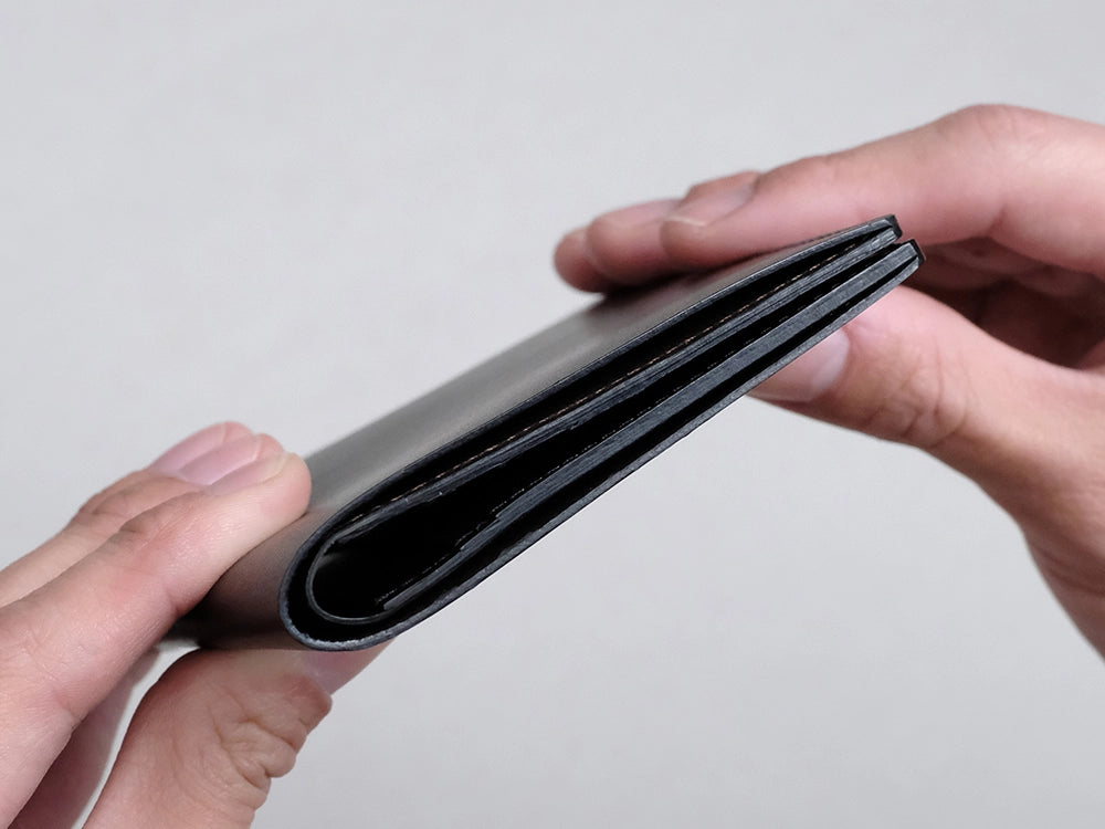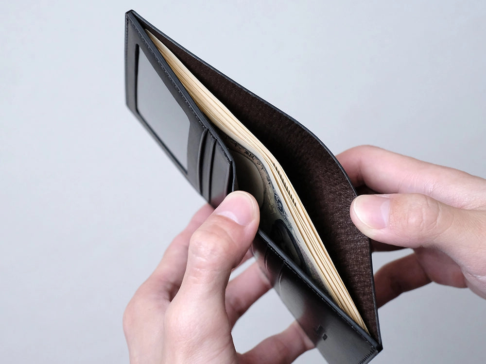 サイズ感: 最大容量(お札約25枚・カード7枚)を収納した場合でも、厚みは約2.1cmに収まります。すっきりとしたフォルムを保ちながらお使いいただけます。