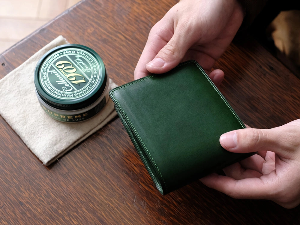 皮革内部へ栄養成分がゆきわたることで皮革に潤いを与え、深みのあるしっとりとしたツヤが生まれます。