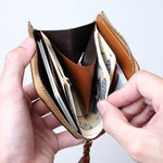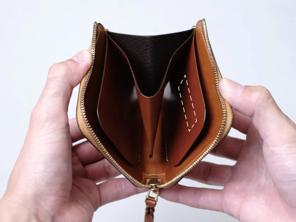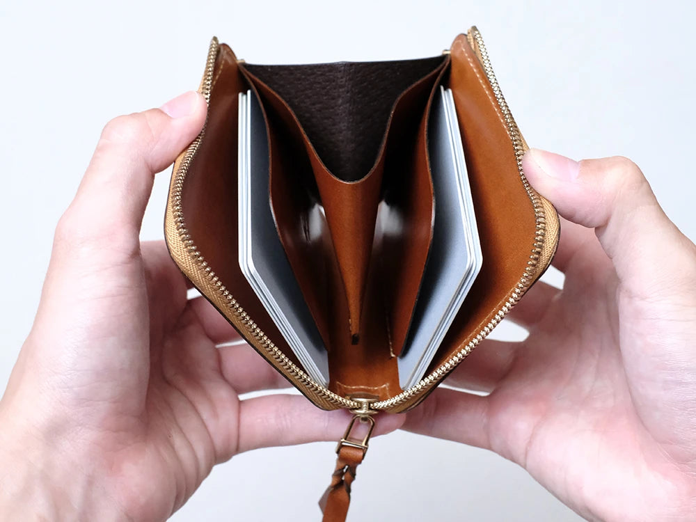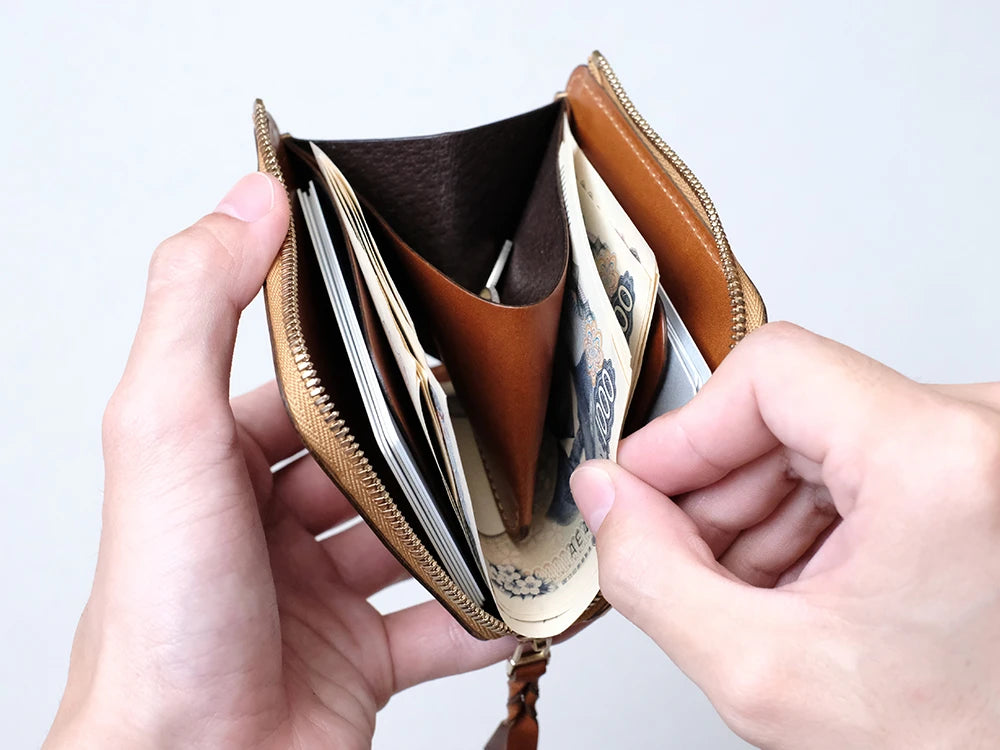 それぞれのスリーブに最大5枚ずつカードが収納可能です。 小銭入れの下を通り、Uの字にお札を入れることで、ファスナーに紙幣が挟まりにくく、スムーズな取り出しができます。