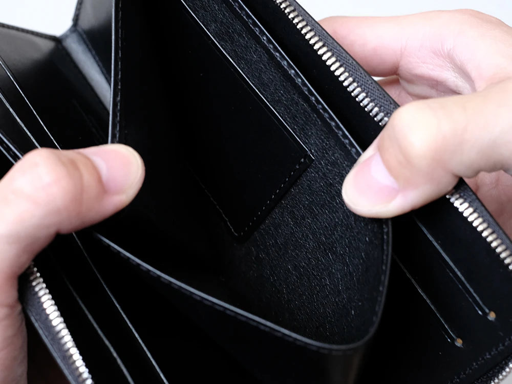 構想から完成まで、社内で幾度も試作し、改良を重ねて完成した独自構造の長財布です。